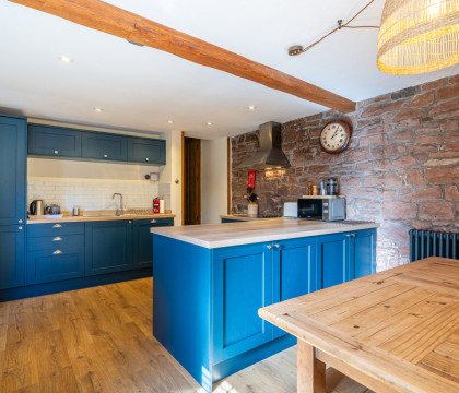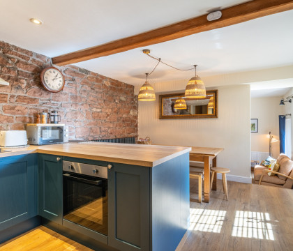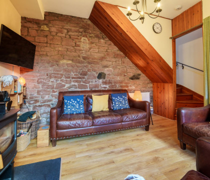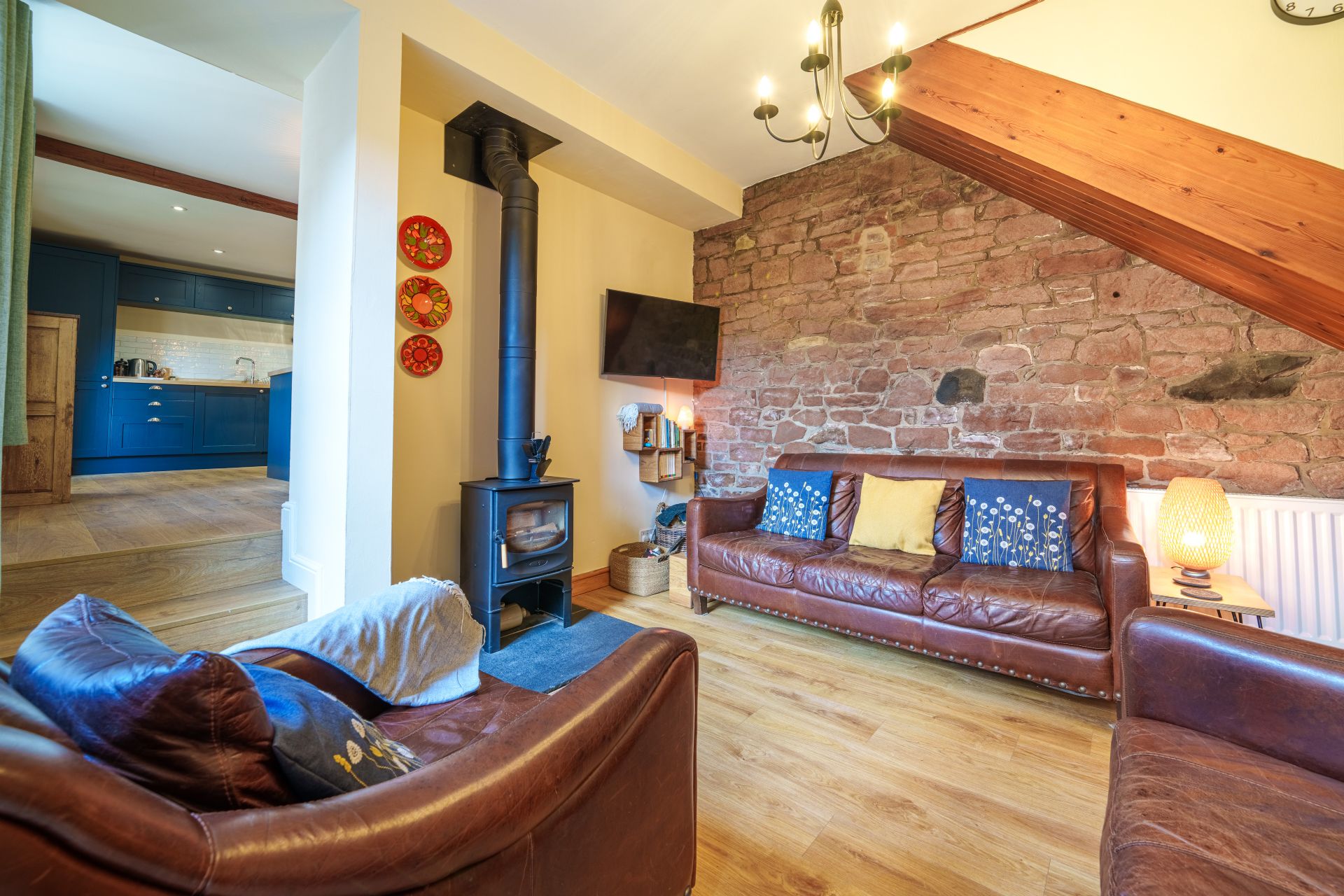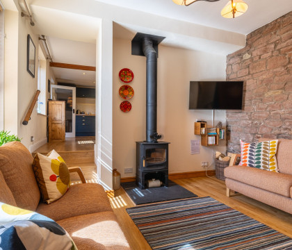 Formally a stable block, the building has been converted into a surprisingly-large holiday home for up to six guests with a spacious open-plan kitchen and dining area. Leading off the kitchen is the first of the two bathrooms with a walk-in shower and loo. Two steps lead down from the dining area into the snug living room with a beautiful log-burning stove to relax in front of after a day out exploring the local area.