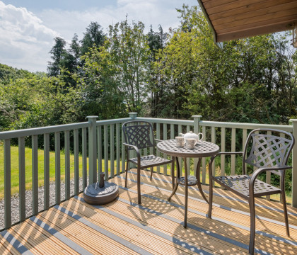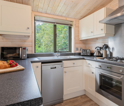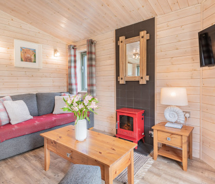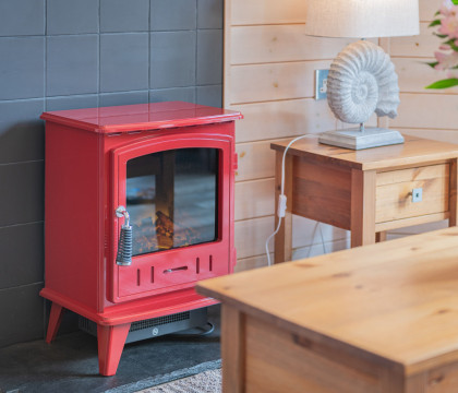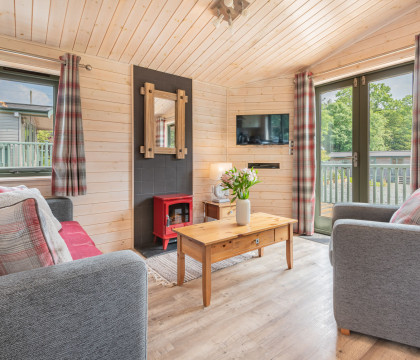 Step inside and discover a warm and inviting space, where Nordic-style decorations and a rich red colour scheme evoke the cosy charm of a traditional log cabin. The open-plan living area seamlessly blends the kitchen, dining, and lounge spaces, with French doors and full-length windows framing picturesque views of the enclosed decking area. Whether you're curling up by the electric fire or enjoying a meal for two at the intimate dining table, every moment at Copse Lodge is designed for relaxation and connection.