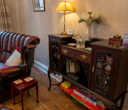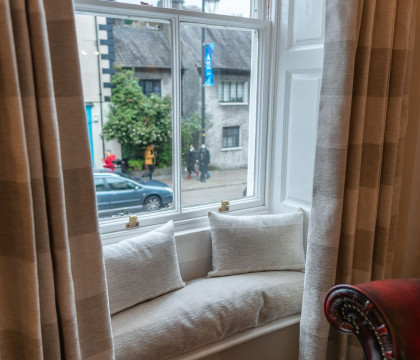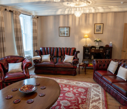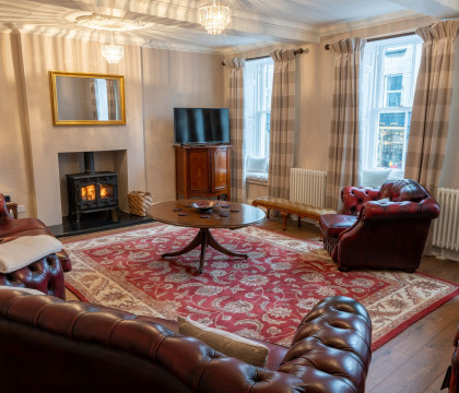 The spacious living room with a wooden floor, large wood burner and comfortable leather sofas and armchairs, seating eight in total, provides guests with superb space for relaxation, plus there is a 40" Freeview Smart TV. Views through the three ceiling-height windows look over the main shopping street called Highgate.