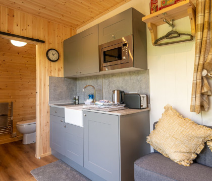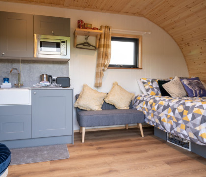 This Lake District Glamping Pod benefits from electric heating, mains electricity, and plumbed-in facilities. It also offers views overlooking open farmland, grazing cows, and sheep.