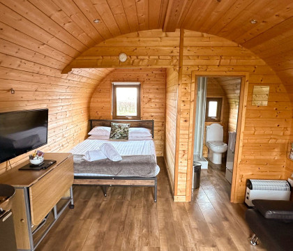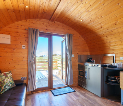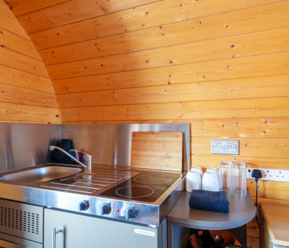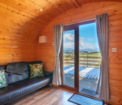 The insulated Pod has been installed to maximise the views, whether inside or outside, on the wooden decking. Inside, the pod is kitted out with all the home comforts, including a flatscreen Freeview TV, sofa, underfloor heating, fold-away dining table and a kitchen area comprising a sink, two-ring electric hob, fridge with freezer box, microwave convection oven and plenty of pots, pans crockery etc. If you don't fancy cooking, there are plenty of local eateries in Keswick, Pooley Bridge or Penrith, all just a short drive away.